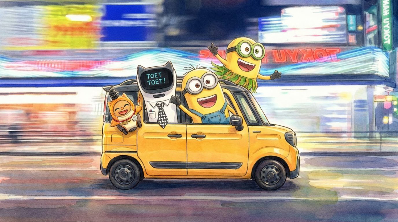 Zoals vrienden al eens doen voor elkaar gaf hij meteen z'n ontslag en mocht hij, of zij, het van z'n baas afbollen. Letterlijk. We mochten aan de levende lijve ondervinden hoe goed hij kon bollen over de straten van Tokio.