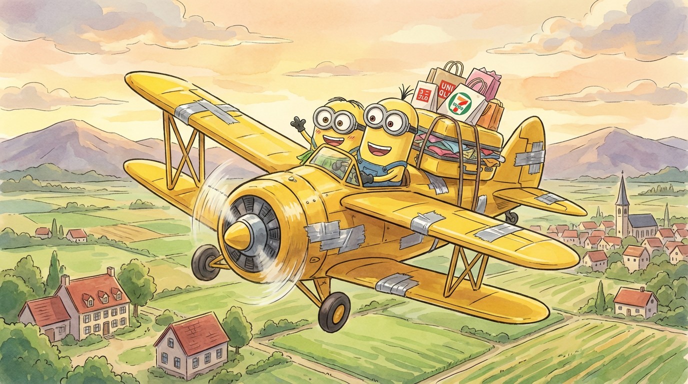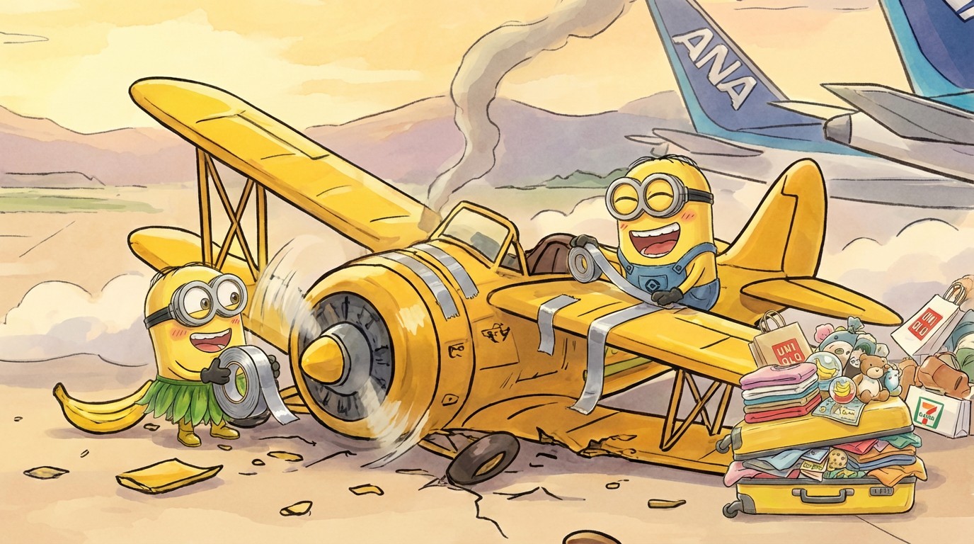 Veilig geland! Die bananenbrandstof heeft z'n werk goed gedaan, nu we eindelijk eens op reis zijn hebben we in sneltempo eerst een toertje rond de wereld gedaan om dan zachtjes te landen op de luchthaven van Tokyo. Missie volbracht.