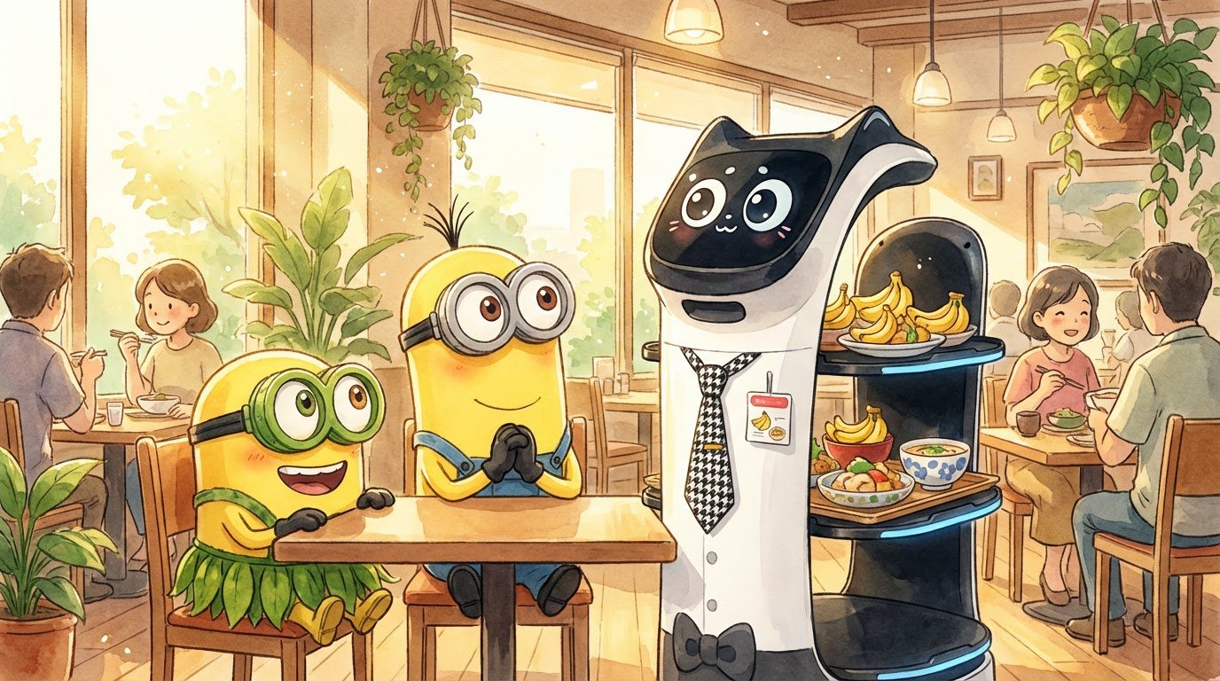En om het vandaag nog extra gezellig te maken, gingen we op pad om nieuwe vriendjes te maken. En in het eerste restaurant hadden we al meteen prijs. Toen hij, of zij, ons kwam verwennen met banaantjes waren we meteen verkocht. De lachtende oogjes, leuke geluidjes en zelfs z'n das was fandastisch. Bij ons gaat het snel, dus we hebben er meteen een vriend voor het leven bij. Voor vandaag toch.
